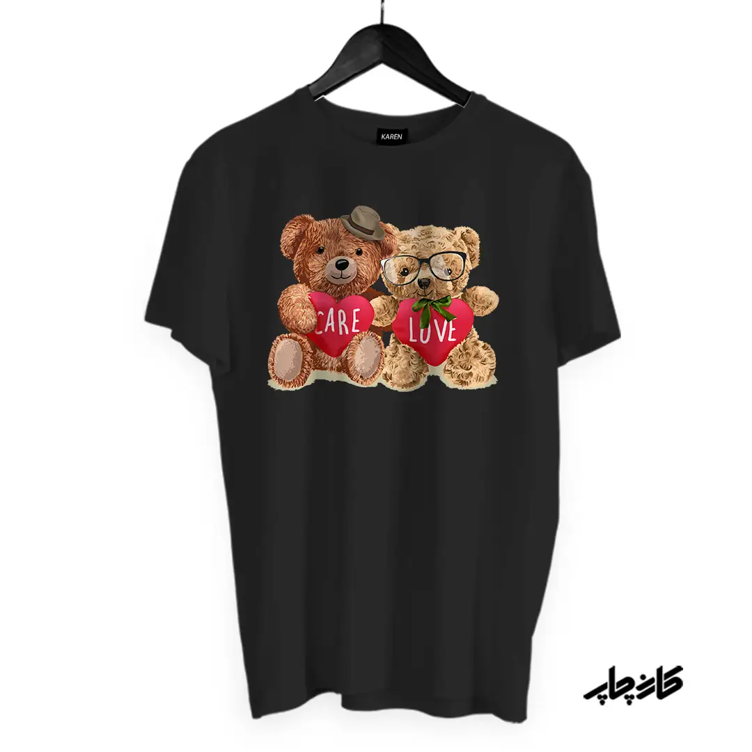چاپ طرح دلخواه روی تیشرت های نخ پنبه مشکی تدی مراقب عشق به ۳ روش لیبلی(ونیل)، مدیا و دیجیتال انجام می پذیرد.