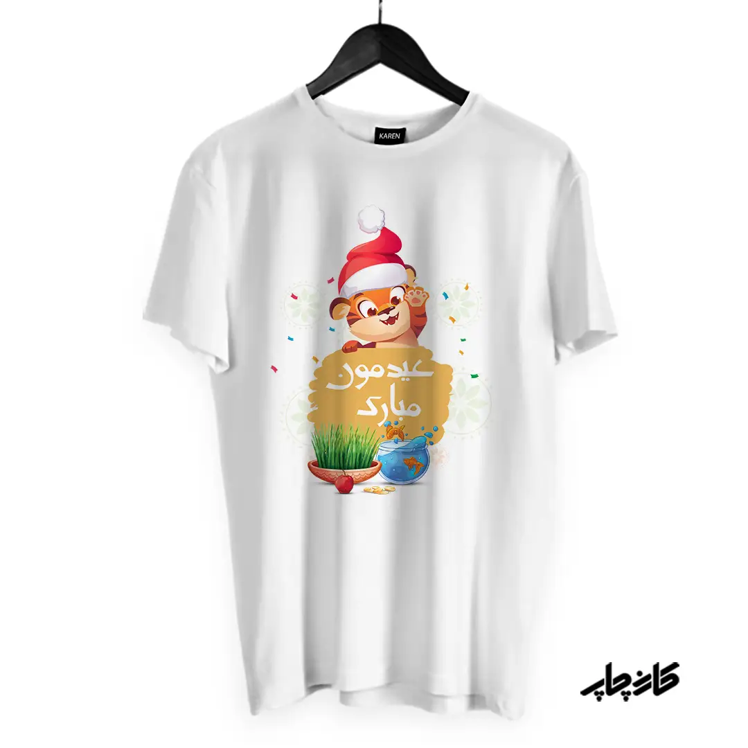 امکان چاپ هر نوع طرح دلخواه بر روی تیشرت برای شما مشتریان عزیز کارن چاپ فراهم شده است. برای خرید تیشرت ببر عیدمون مبارک یا برای خرید تیشرت طرح دلخواه خودتان، کافی است طرح موردنظرتان را برای ما ارسال کنید. کارن چاپ با بهترین کیفیت، تیشرت شما را چاپ کرده و در کمترین زمان ممکن، برای شما ارسال میکند. تخصص ما چاپ تیشرت طرح دلخواه مشتری است. خریدی آسان و امن را با ما تجربه کنید.