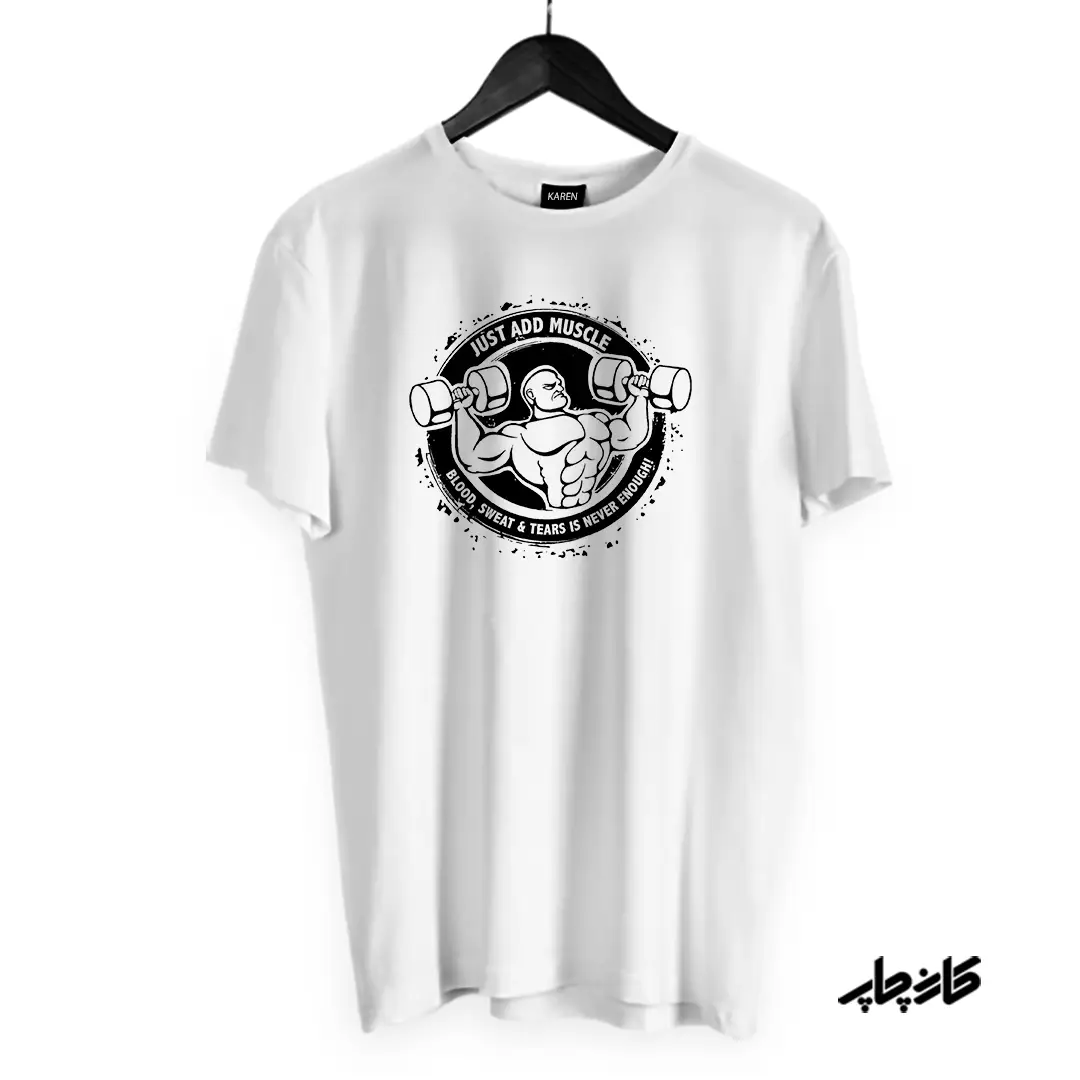 تیشرت با طرح دلخواه تیشرت بدن سازی Just Add Muscle موجود در فروشگاه کارن چاپ از جنس نخ پنبه و پلی استر بوده که ۷۰% آن پنبه و ۳۰% آن پلی استر می باشد .