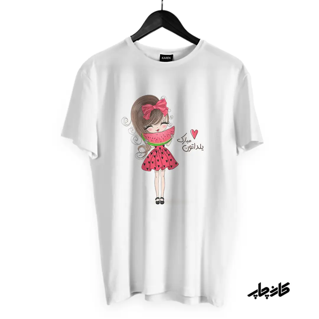 امکان چاپ هر نوع طرح دلخواه بر روی تیشرت برای شما مشتریان عزیز کارن چاپ فراهم شده است. برای خرید تیشرت دخترانه یلداتون مبارک یا برای خرید تیشرت طرح دلخواه خودتان، کافی است طرح موردنظرتان را برای ما ارسال کنید. کارن چاپ با بهترین کیفیت، تیشرت شما را چاپ کرده و در کمترین زمان ممکن، برای شما ارسال میکند. تخصص ما چاپ تیشرت طرح دلخواه مشتری است. خریدی آسان و امن را با ما تجربه کنید.