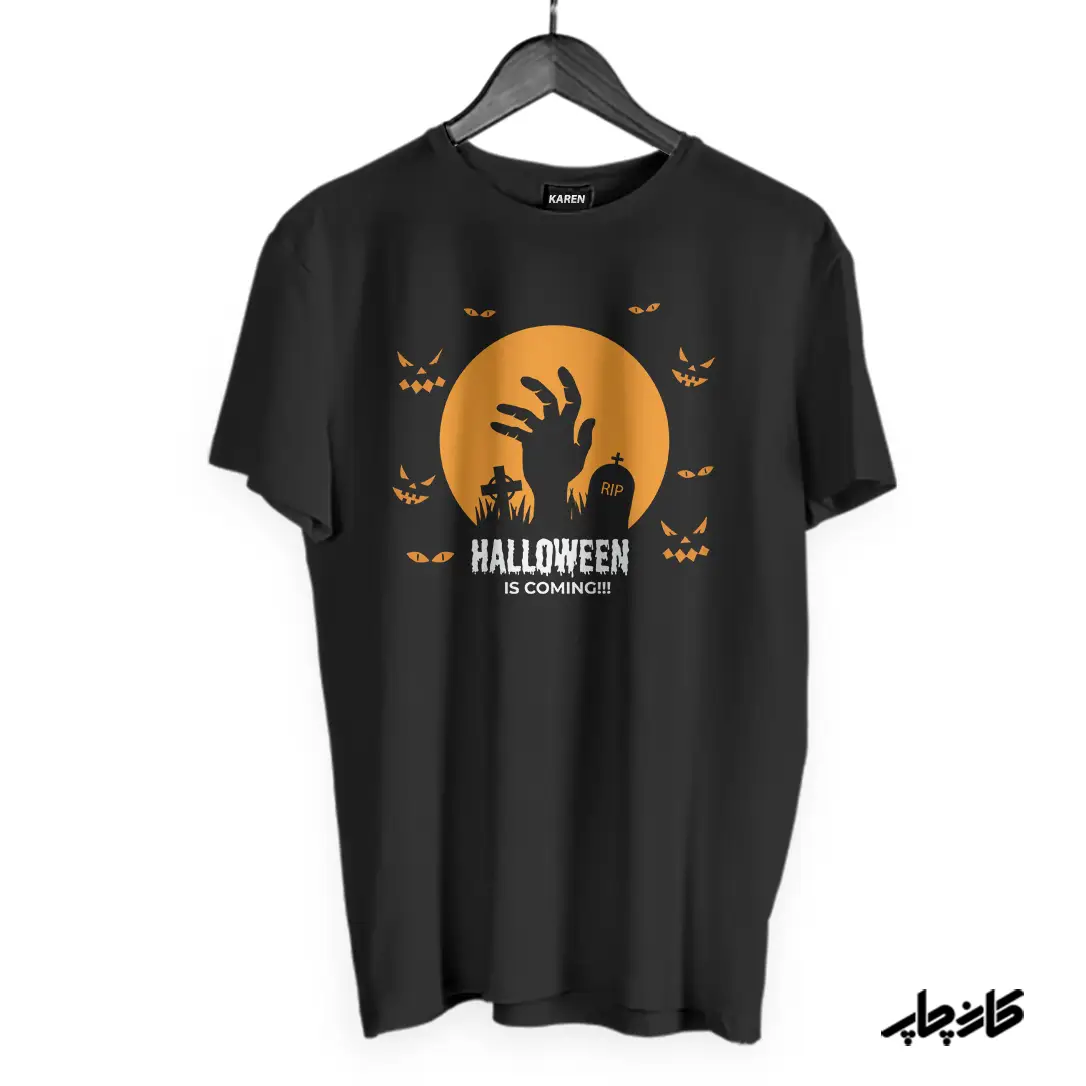 تیشرت مشکی با طرح دلخواه هالووین Halloween is coming محصول کارن چاپ جنس این تیشرت مشکی از الیاف پنبه ۱۰۰% تشکیل شده است. که برای استفاده طولانی مدت بسیار مناسب می باشند. هنگام پوشیدن لطافت زیادی دارد و برای پوست بدن آزار دهنده نیست.