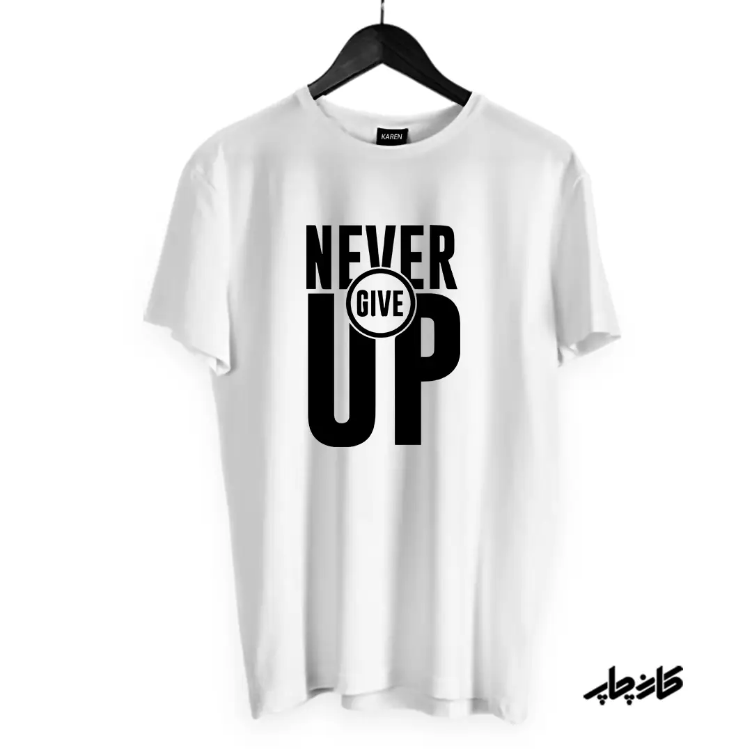 چاپ روی تیشرت با طرح دلخواه Never Give Up موجود در فروشگاه کارن چاپ از جنس تی شرت نخ پنبه و پلی استر بوده که ۷۰% آن پنبه و ۳۰% آن پلی استر می باشد .