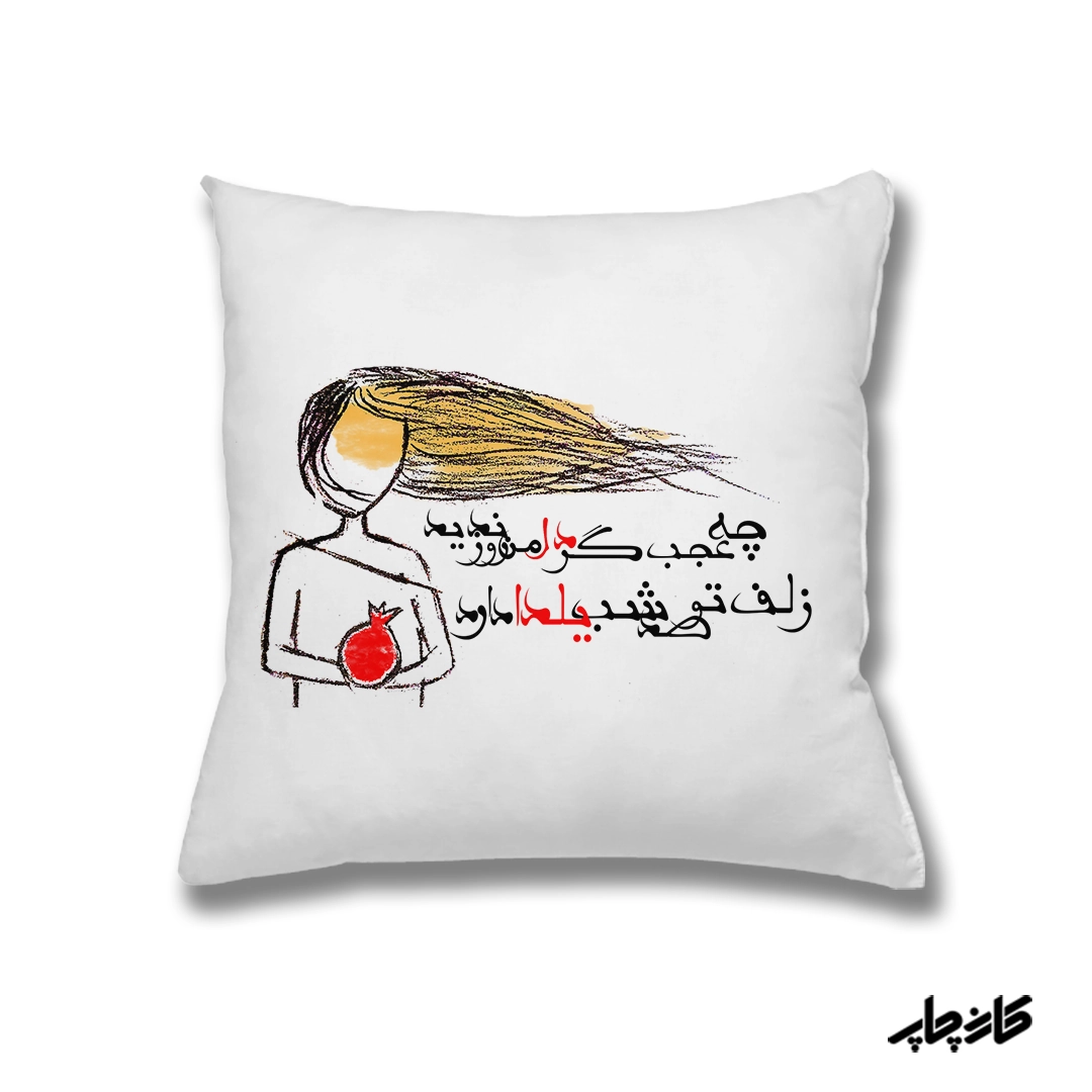 چاپ روی کوسن زلف تو صد شب یلدا دارد ؛ کارن چاپ از پارچه مخمل با کیفیت تولید شده است.