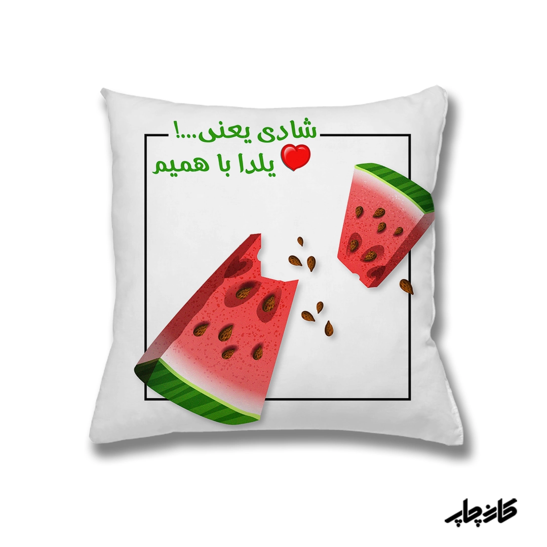 چاپ روی کوسن شادی یعنی یلدا باهمیم ؛ کارن چاپ از پارچه مخمل با کیفیت تولید شده است.