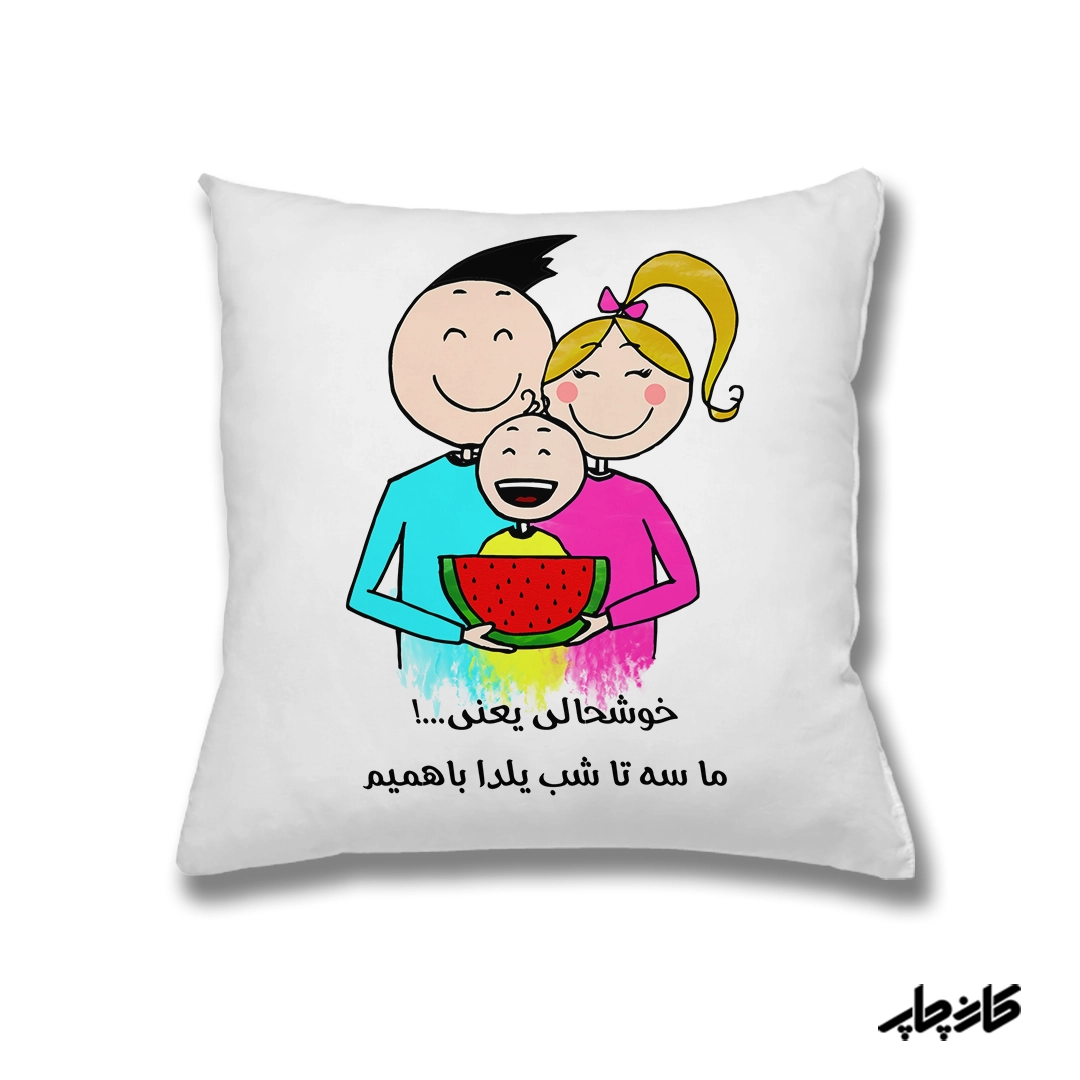 چاپ روی کوسن یلدایی خوشحالی یعنی ما سه تا شب یلدا باهم باشیم ؛ کارن چاپ از پارچه مخمل با کیفیت تولید شده است.